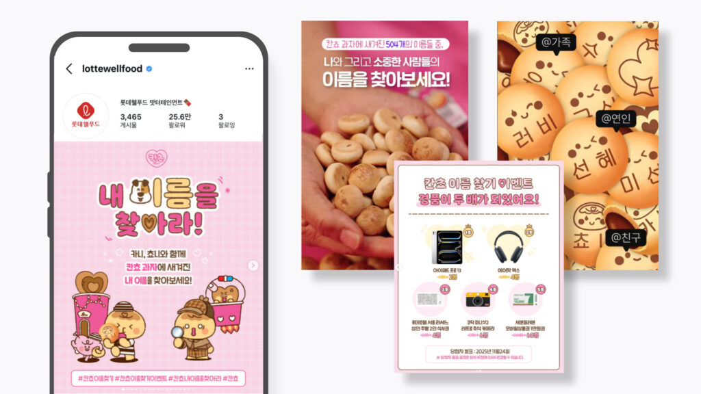 1984년 출시되어 현재까지 꾸준히 사랑받아 온 과자 칸쵸는 올해 과자에 이름을 새기는 ‘내 이름을 찾아라’ 이벤트로 다시 전성기를 맞았습니다. 칸쵸는 신생아 이름 500개와 칸쵸 세계관 캐릭터 이름 4개를 포함해 총 504개의 이름을 무작위로 새겼는데요. 자신이나 친구, 연인의 이름을 찾아 인증하면 경품에 응모할 수 있는 이벤트도 진행하며 폭발적인 반응을 얻었어요.