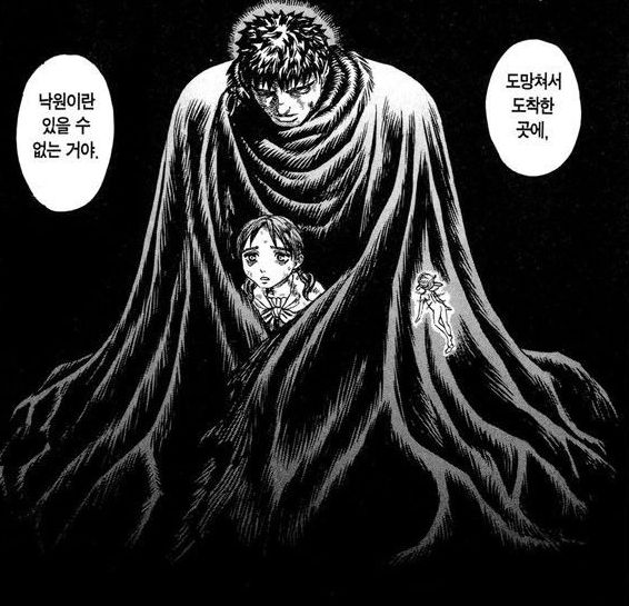 그런데 이 말이 언급된 만화 '베르세르크'의 맥락을 보면 그렇게 이해되선 안 됩니다. 이 명대사는 주인공 '가츠'가 한 소녀 '질'에게 건넨 말입니다.