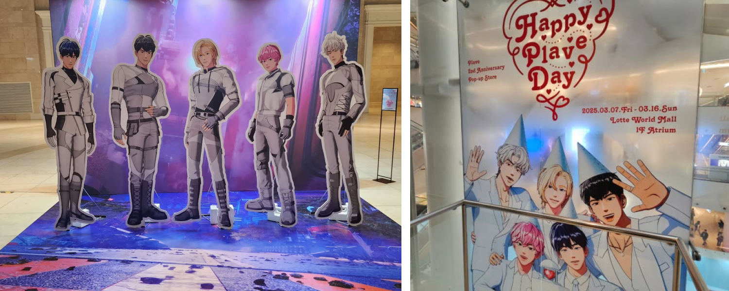 잠실 롯데월드몰 1층, 대형 팝업스토어 공간인 아트리움에서 진행된 플레이브 팝업스토어입니다. 데뷔 2주년을 기념해 운영된 이번 팝업스토어는 사전 예약 대기 접속자만 2만 5천 명 이상을 기록하며 엄청난 관심을 받았어요! 팝업스토어 내부는 체험존과 MD존, 라이브포토존으로 크게 세 구역으로 구성되었으며 2주년 기념 대형 케이크부터 생일상, 트로피 전시, 50여 개의 한정판 굿즈까지 팬심을 저격하는 콘텐츠가 가득했죠.
