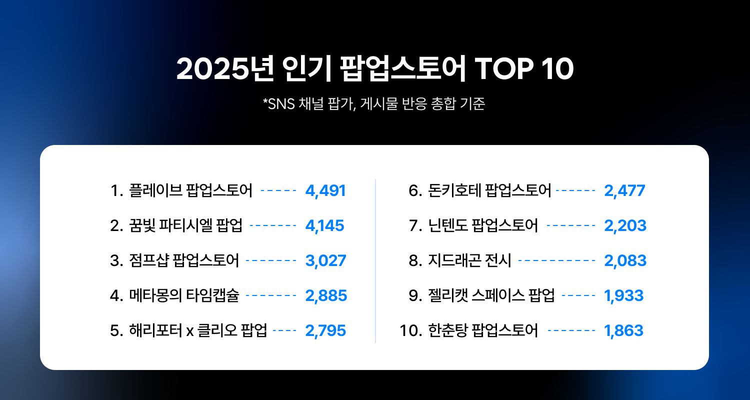 올해 운영된 3,077개의 팝업스토어 데이터를 기반으로 정리한 🔗[2025 팝업스토어 총결산 & 2026년 전망집]을 무료로 받아보실 수 있어요.