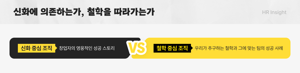 창업자의 가치관과 행동이 조직 안에서 어떻게 드러나고 해석되는지에 따라 ‘신화 중심 조직’과 ‘철학 중심 조직’으로 구분됩니다.