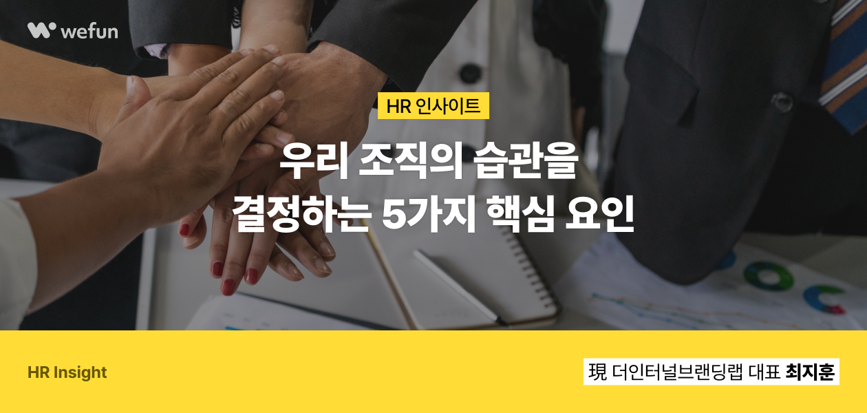 위펀은 HR 실무진에게 더욱 전문적이고 다양한 인사이트를 전하기 위해 각 분야 전문가를 필진으로 모십니다. 이번 <HR 인사이트>는 더인터널브랜딩랩 대표이자 《그래서, 인터널브랜딩》 저자인 최지훈 님이 참여해 주셨어요.