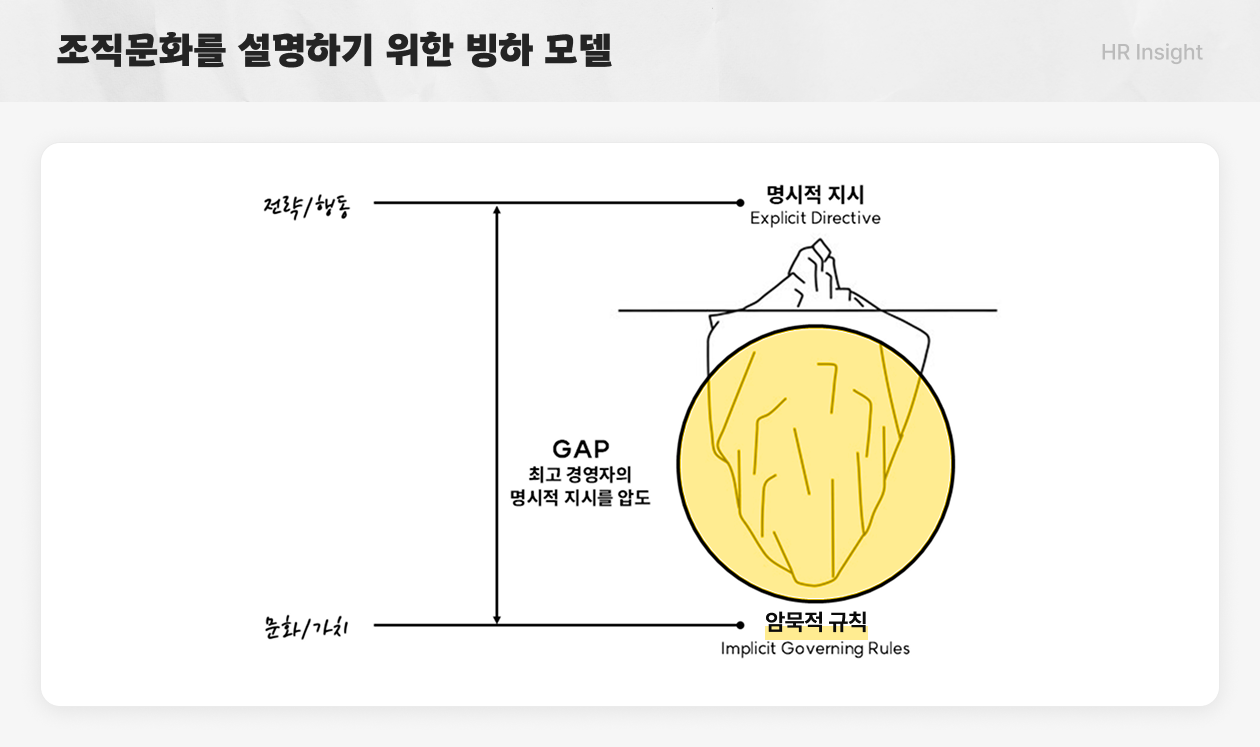 조직문화를 설명할 때 흔히 빙하 모델(Iceberg Model)'이 사용됩니다. 빙하의 거대한 덩어리는 크게 두 부분으로 나뉘는데, 바로 해수면 위에 떠 있는 '명시적 지시'와 해수면 아래에 숨겨진 '암묵적 규칙'입니다.