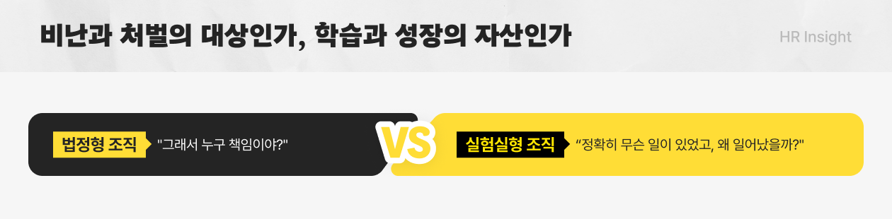 실패를 바라보는 시각에 따라 ‘법정형 조직’과 ‘실험실형 조직’으로 구분할 수 있습니다.