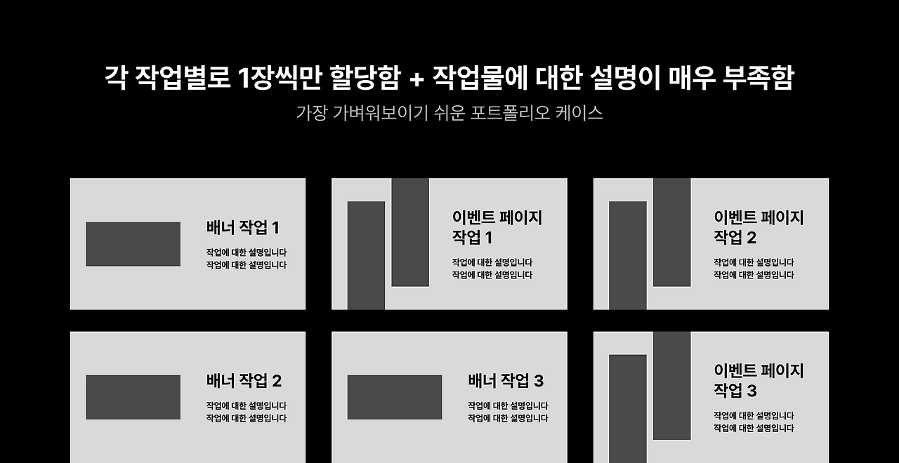 가끔 그런 포트폴리오가 있다. 포트폴리오 PDF 파일을 보는데 장표 1장당 배너와 이벤트 페이지가 1개씩 들어 있다. 심지어 이 작업에 대한 설명도 부족하다.(000 작업 - 여기서 설명이 끝나는 경우도 많다) 이런 포트폴리오는 위에서 얘기한 것처럼 [배너와 이벤트 페이지(또는 상세 페이지)를 공장 돌리듯이 만든] 포트폴리오다. 다시 말해 [아무 생각 없이 정해진 범위 내에 디자인만 만든 사람]으로 보이기 쉽다. 안타깝게도 회사에서는 이런 사람을 뽑지 않는다. 이런 사람을 뽑는다면, 기간제나 아르바이트를 뽑을 것이다.
