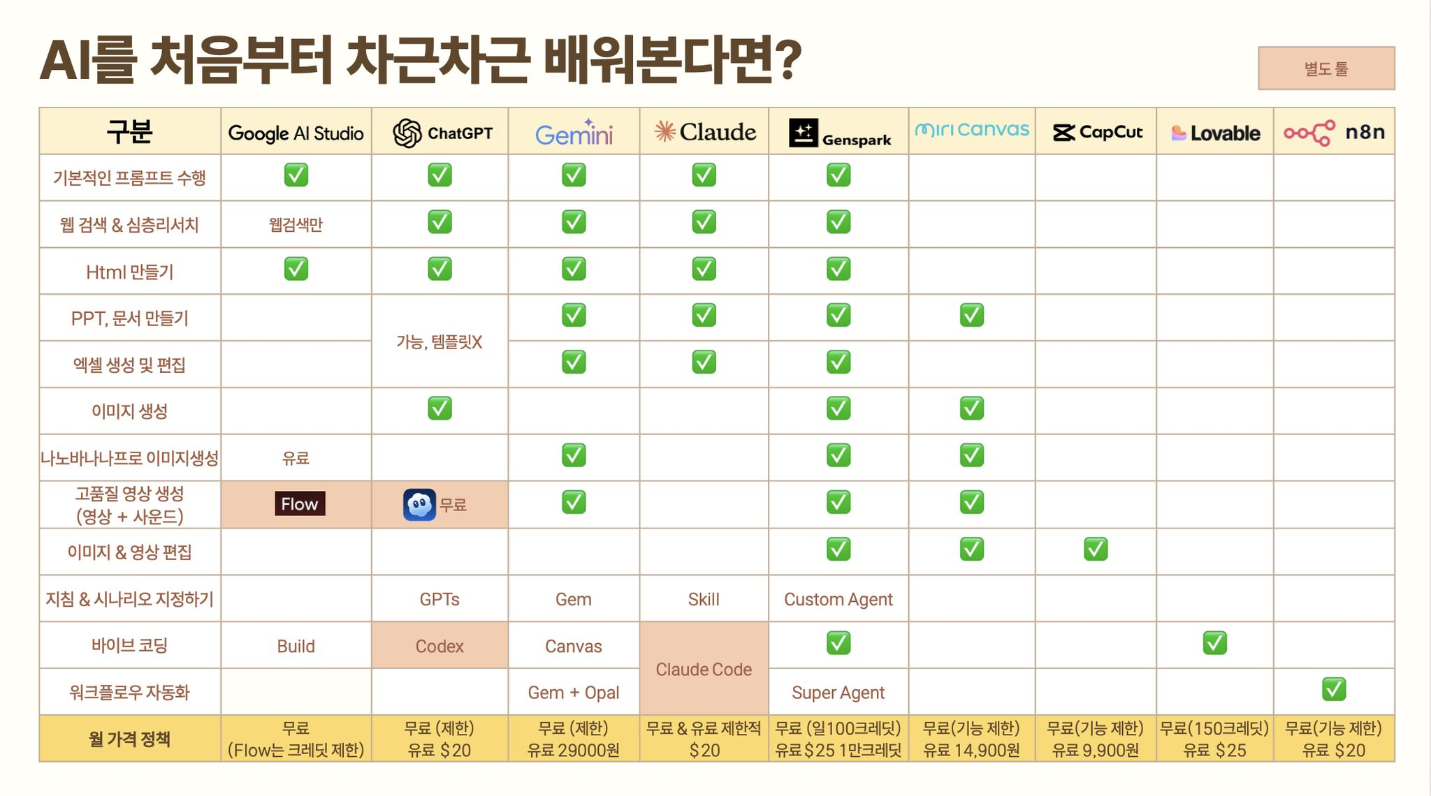 2024년 중반부터 쏟아지는 AI 툴의 변화 소식을 접했습니다. ChatGPT의 등장과 GPTs, 클로드의 스타일과 프로젝트, 제미나이의 나노바나나, 젠스파크의 혜성 같은 등장과 바이브워킹, 러버블의 바이브코딩, 클로드 스킬과 코드, 제미나이의 나노바나나프로와 오팔까지…