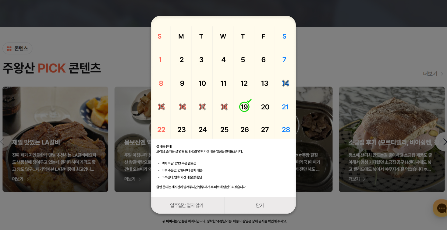 배송 마감 기한을 메인 페이지 팝업으로 띄워 긴급 구매와 설 전용 제품으로의 유입을 유도할 수 있어요.
