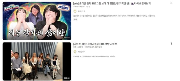 나영석 채널의 라이브는 기존 예능 콘텐츠의 세계관을 라이브 포맷으로 확장한 사례입니다. ‘침착맨’과는 또 다르게 기존 예능의 형식을 어느 정도 가져오고 게스트들이 주를 이루는 콘텐츠로 게스트들의 팬과 채널의 팬이 합쳐져 시너지를 보이는 채널이죠. 그래서 라이브 특유의 느슨함과 예측 불가능성은 게스트의 팬들에게는 보너스 콘텐츠처럼 받아들여집니다.