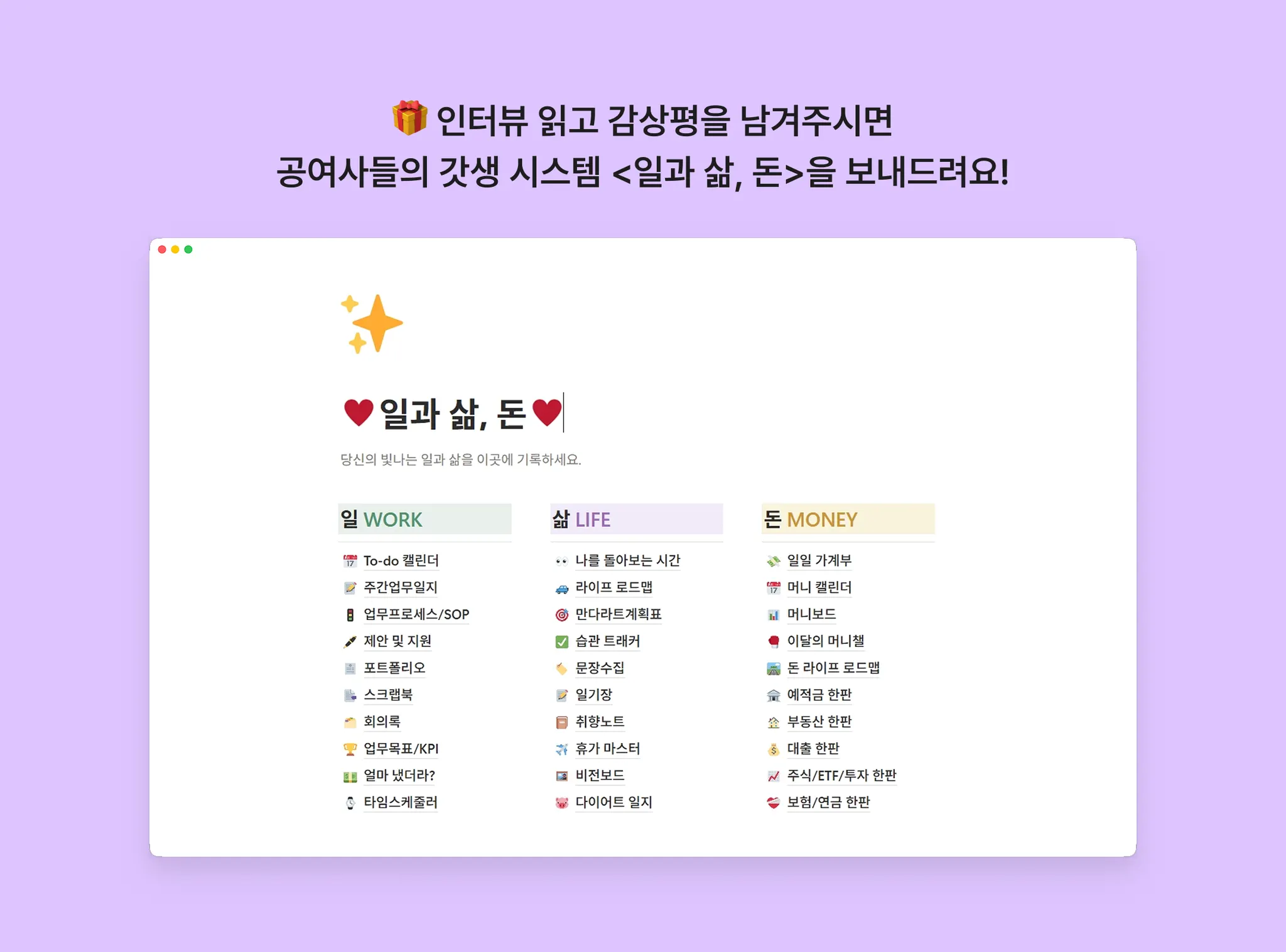 경품: 공여사들 <일과 삶, 돈 - 노션 템플릿 30종 세트> (99,000원 상당, 총 3명)