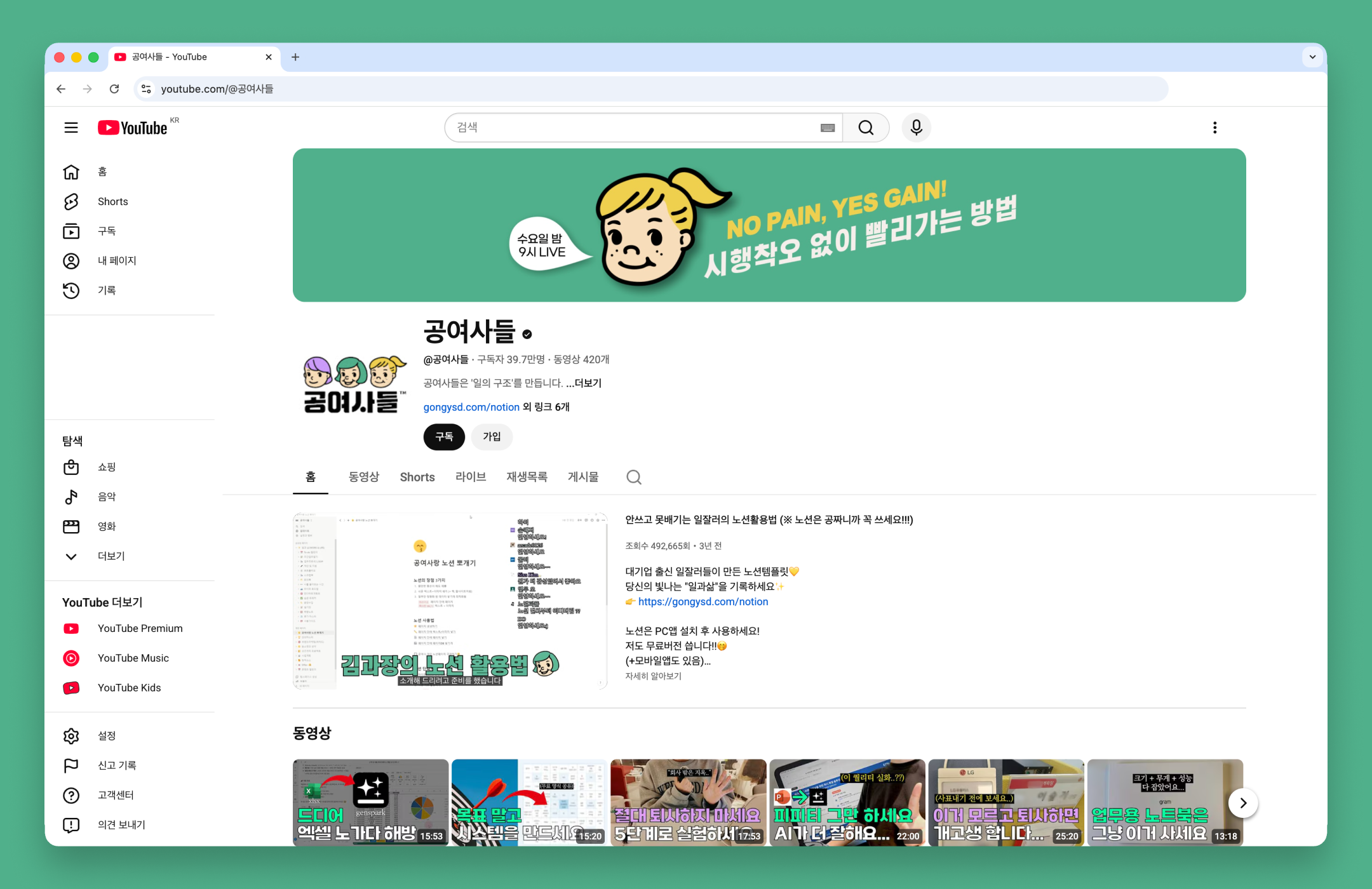멀리서 찾지 않았어요. 회사에서 매일 하던 엑셀 작업과 보고서를 그대로 콘텐츠로 옮겼거든요. 처음 올린 영상이 ‘직장인 엑셀팁’ 콘텐츠였는데 조회수가 처참했죠. 그러다 마침 코로나로 재택근무가 확산되던 시기에 재미로 올렸던 ‘엑셀로 로또 번호 뽑기’ 영상이 알고리즘을 타기 시작했어요. 일주일 만에 구독자가 3만 명이 늘었고, 특히 4050 남성분들이 많이 유입됐어요. 덕분에 최초 발행했던 엑셀팁 콘텐츠가 덩달아 떡상하며 지금은 조회수 600만을 기록한 대표 영상이 됐죠. 그때부터 제 인생도 같이 방향을 틀기 시작했던 것 같아요.