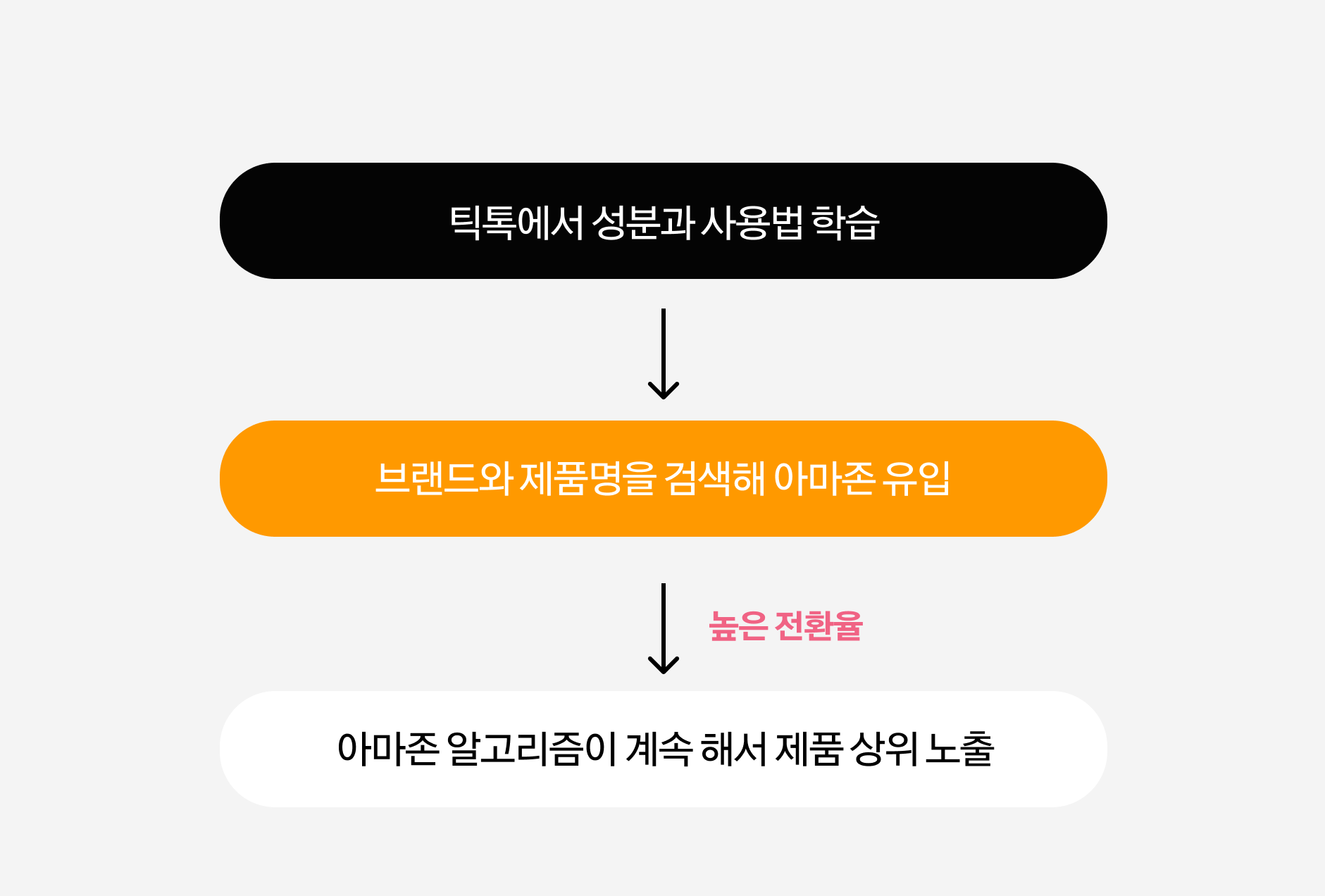 닥터멜락신은 미국 시장 진출 초기부터 ‘틱톡샵’을 메인 채널로 설정하고, 인게이지먼트를 쌓는 데 집중했습니다. 사용 맥락이 명확하게 드러나는 콘텐츠로 빠르게 알고리즘을 탔고, 틱톡샵 판매 성공사례가 누적되며 점차 입지를 늘려나갔죠. 이후에도 지속적으로 생성된 틱톡 콘텐츠를 통해 닥터멜락신을 접한 시청자는 제품 성분과 사용법을 자연스레 학습했고, 브랜드와 제품명을 검색해 아마존으로도 이동했습니다. 이 트래픽이 높은 전환율로 이어지면서 아마존 알고리즘은 닥터멜락신 제품을 바로 노출시켰죠.