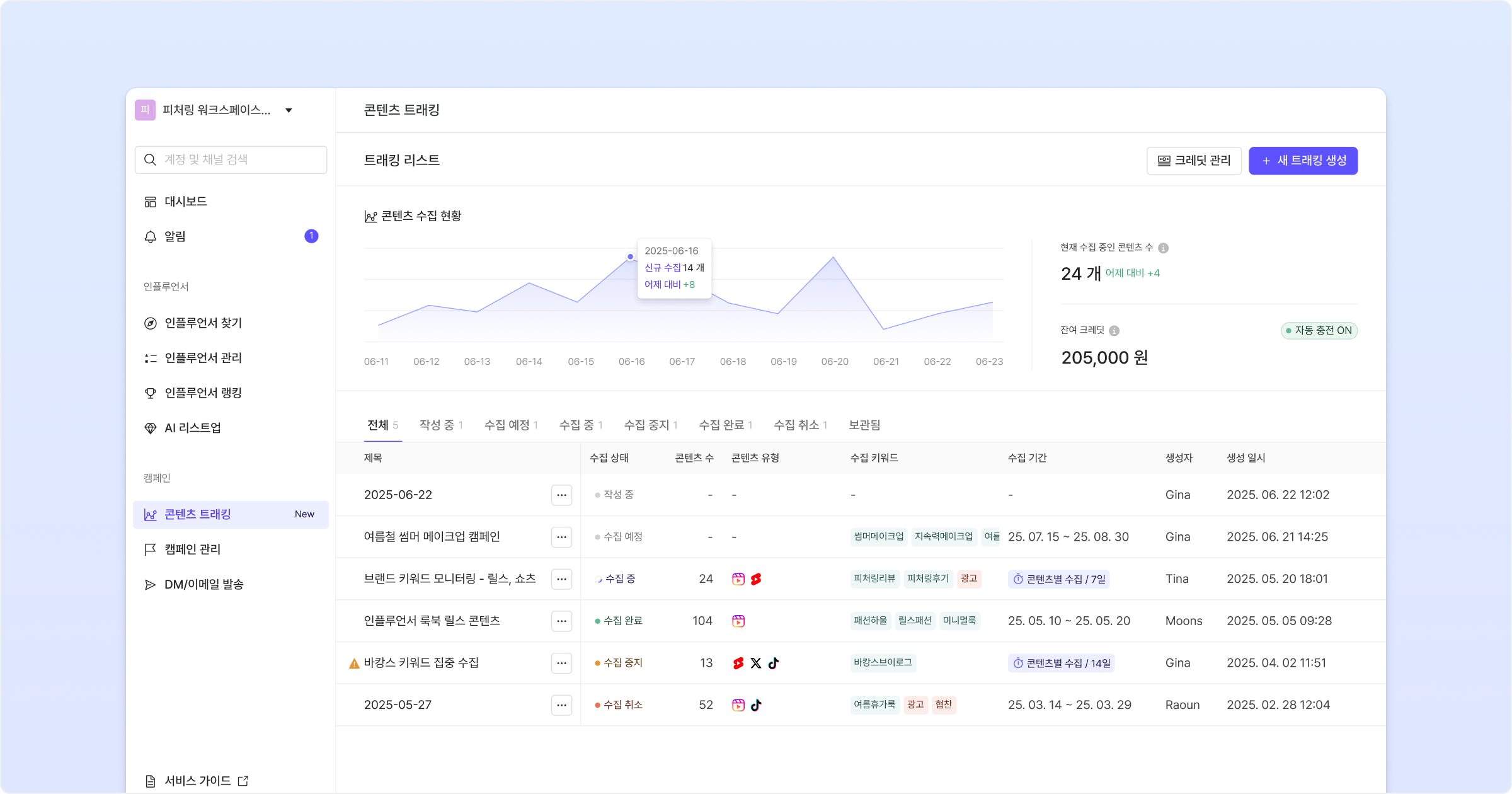 콘텐츠 트래킹 기능은 협업 콘텐츠가 업로드되는 순간부터 성과를 자동으로 모니터링합니다.