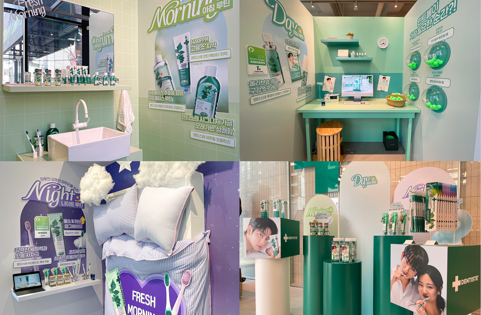 먼저 모닝존은 하얀 타일과 세면대로 아침 화장실 풍경을 그대로 옮겨놓았습니다. 그 위엔 자고 일어난 직후 쓰기 좋은 고불소 치약과 가글을 배치해 아침의 상쾌함을 시각화했죠. 이어지는 데이존은 사무실 책상처럼 꾸며졌는데요. 업무 중 간편하게 리프레시할 수 있는 구강 스프레이와 민트볼을 소품들과 함께 배치해"간편하게 쓰기 좋겠다"라는 생각이 절로 들게 만들었습니다. 마지막 나이트존은 아늑한 침실 무드로 연출되었고 침대 옆 협탁에 저녁에 쓰기 좋은 치약과 칫솔을 두어, 하루의 마무리를 덴티스테와 함께한다는 메시지를 직관적으로 전달했어요. 이렇게 각 존마다 해당 시간대에 맞는 오랄케어 제품을 함께 배치함으로써, 방문객이 ‘이 제품을 언제, 어떤 상황에서 사용하면 좋은지’를 별도의 설명 없이도 자연스럽게 이해할 수 있도록 유도했습니다.