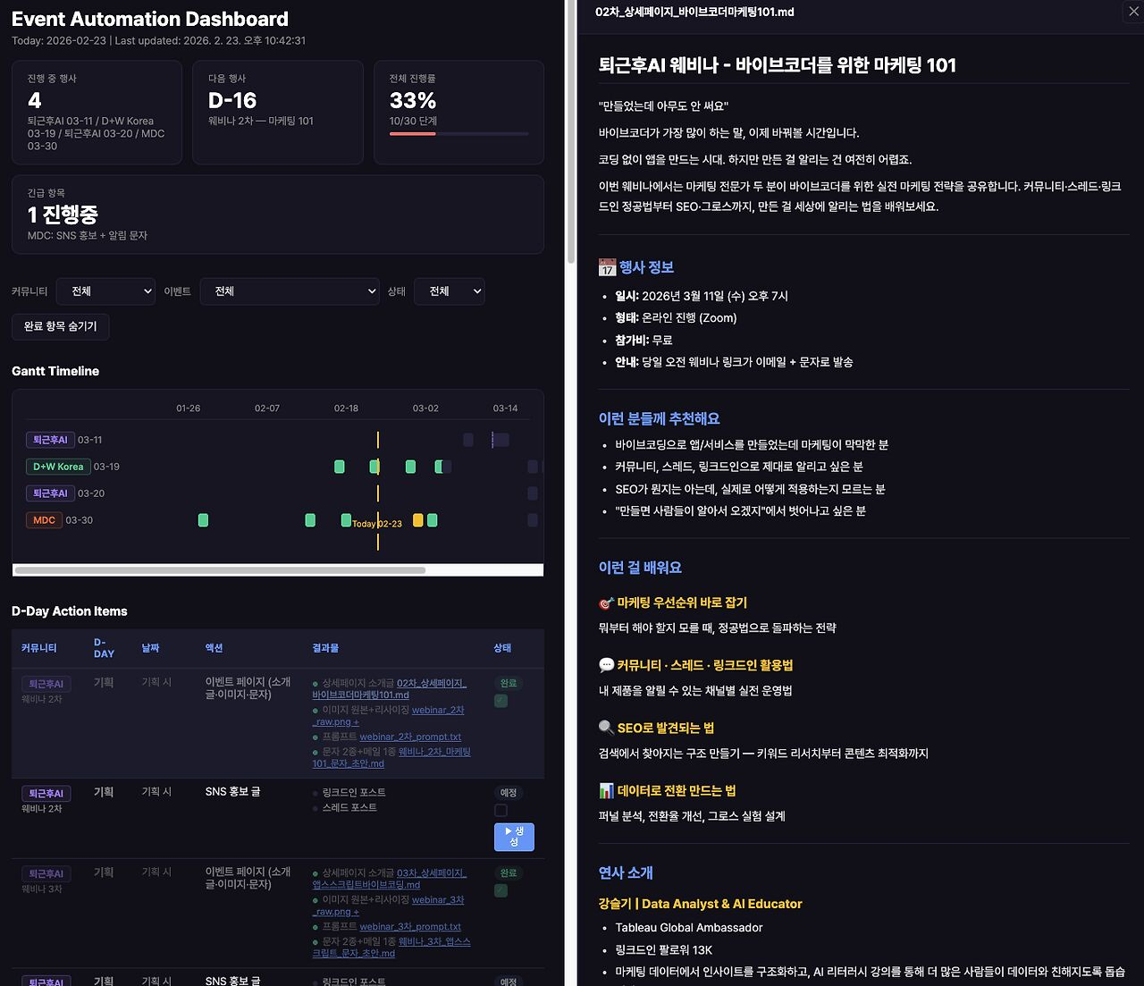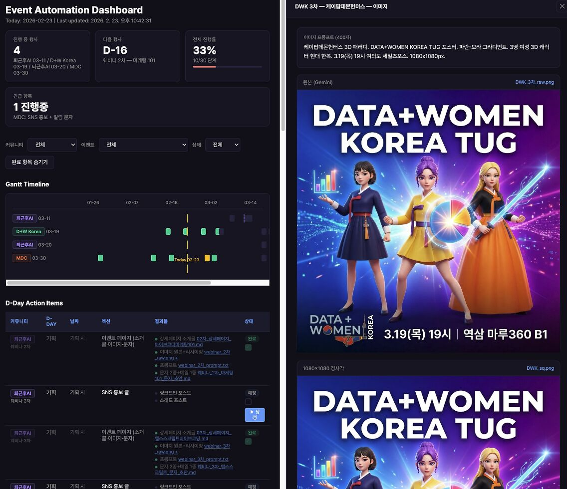큰 맘 먹고 제가 운영 중인 커뮤니티 3개(마케팅데이터커넥트, 퇴근후AI, DATA+WOMEN KOREA)의 운영 업무를 통째로 자동화해봤습니다.