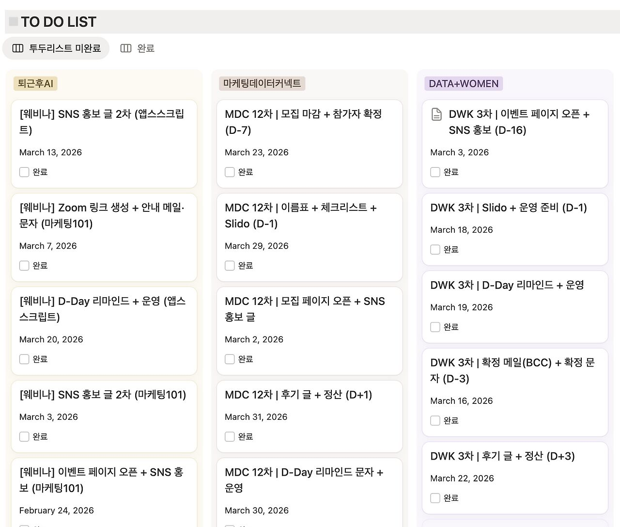 행사 운영 시 띄울 슬라이드도 만들고 노션에 일정별 To do list도 등록해줍니다.