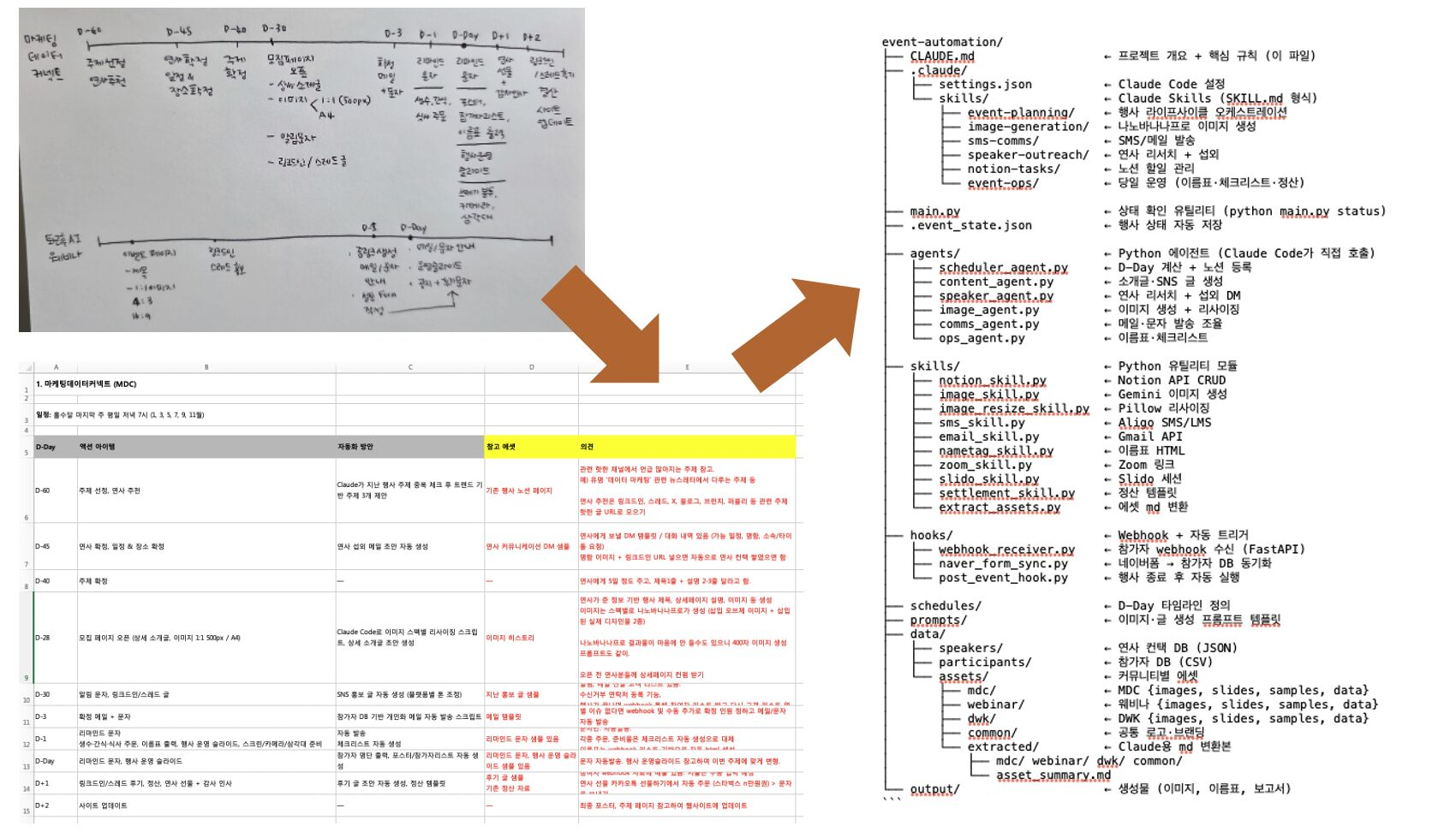 1️⃣ 펜을 꺼내서 D-Day 기준 역순으로 기간별 액션 아이템을 손으로 그렸어요. 누가, 뭘, 언제, 어떻게, 어디서 - 육하원칙으로요. 솔직히 전체 과정 중에 이 밑그림 그리는 게 가장 머리 아팠습니다.