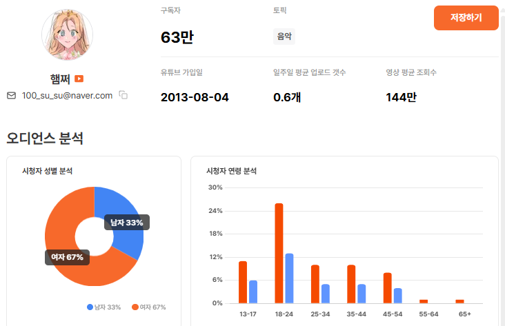 2위는 ‘햄쩌’ 입니다! 구독자 63만 규모지만 최근 평균 조회수는 140만 내외로, 구독자 대비 파급력이 꽤 높은 편이에요. 특히 13–24세 여성 비중이 높아서 Z세대 여성 타겟 브랜드라면 눈여겨볼 만한 채널입니다.