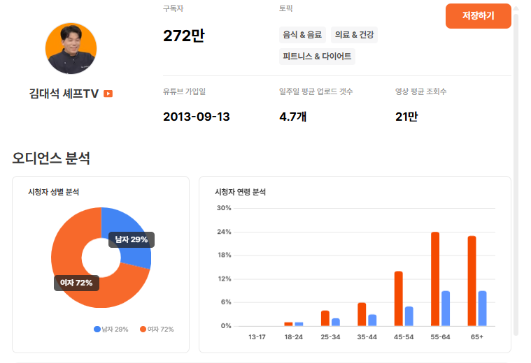 구간 2위는 김대석 셰프TV입니다. 채널명처럼 요리 레시피를 소개하는 채널로, 55–64세, 65세 이상 비중이 특히 높고 여성 시청자가 70% 이상인 중장년 여성·주부층 타겟이 매우 선명한 채널입니다. 다른 채널 대비 타겟이 뚜렷하게 모여 있다는 점이 가장 큰 특징입니다.