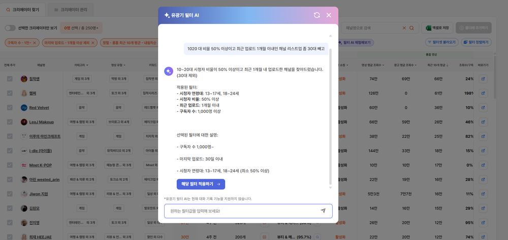 실제 광고 집행이나 협업 전략에 참고할 수 있도록 과거에 한 번 터진 채널이 아니라 지금 이 시점에도 ‘현재형으로 잘 나가는 채널’인거죠.