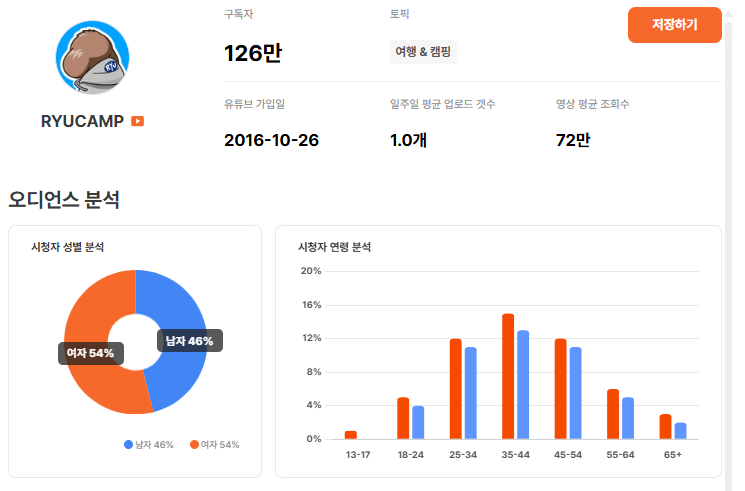 25–44세 구간 1위는 RYUCAMP입니다. 25–34세, 35–44세 비중이 고르게 높게 형성되어 있고 남녀 비율도 비교적 균형 잡힌 구조라 가구 단위 소비 타겟까지 확장 가능한 채널입니다. 라이프스타일 소비층이 모여 있는 채널에 가깝죠.