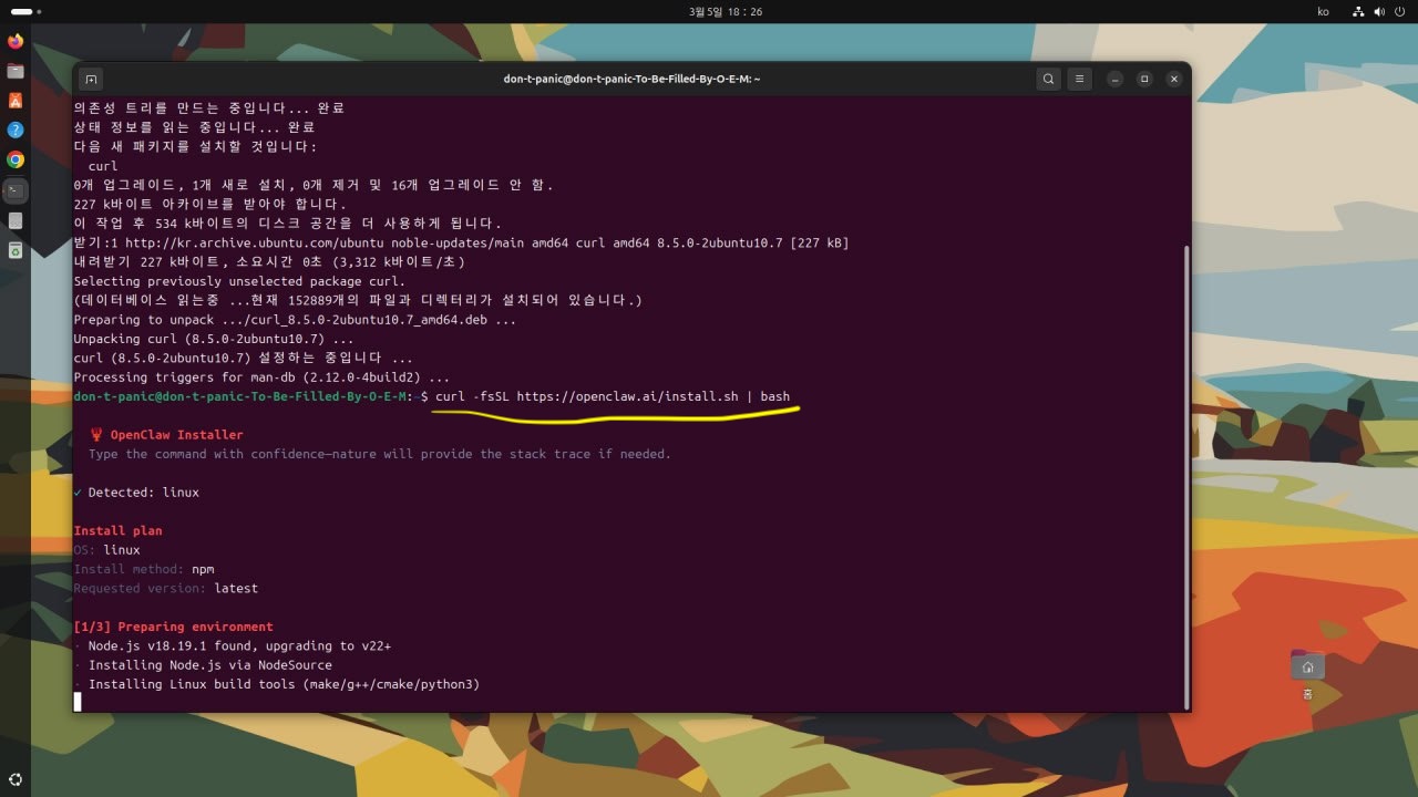 환경 준비. 오픈클로가 돌아가려면 Node.js라는 엔진이 필요하다. 설치 스크립트가 이 컴퓨터에 Node.js가 있는지 확인하고, 없으면 알아서 깔아준다. 버전이 낮아도 알아서 업그레이드한다.