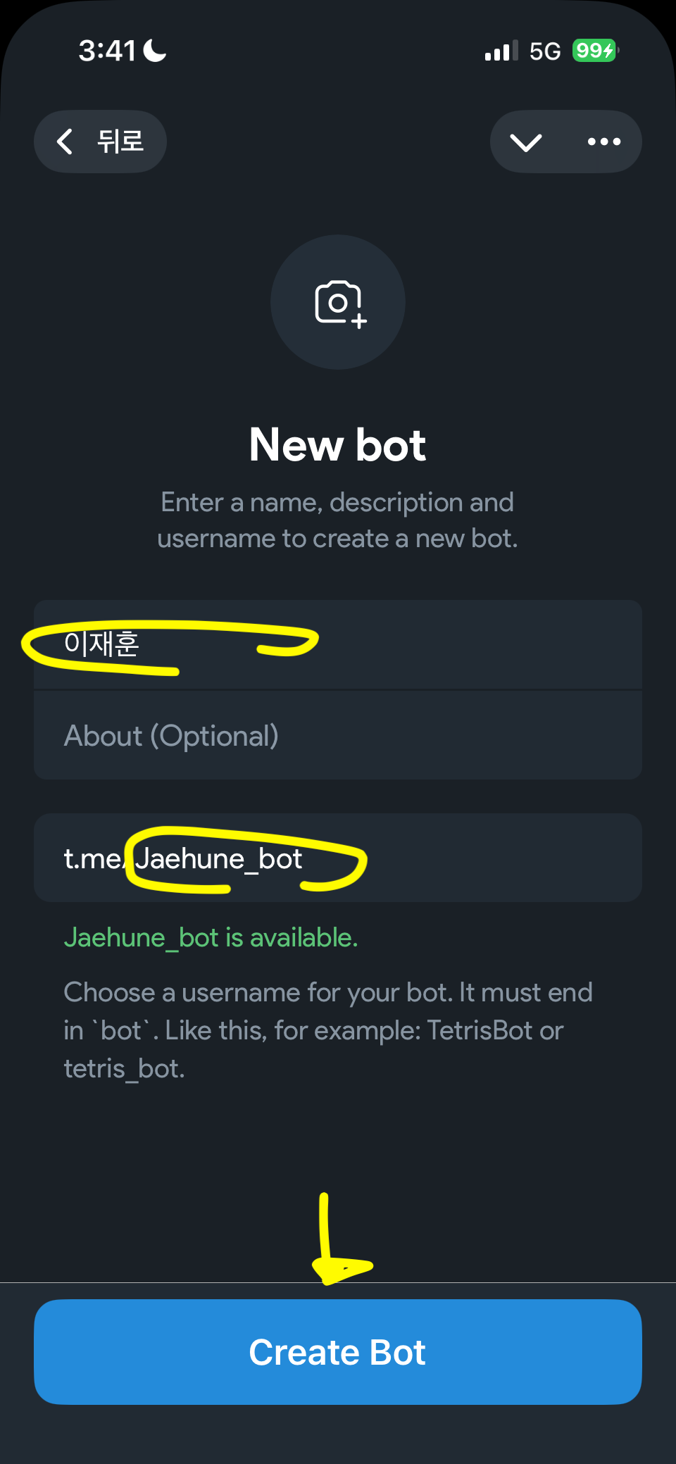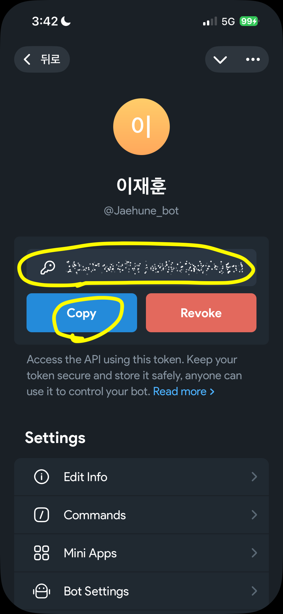 BotFather 대화창 열고 Open 버튼 터치 -> Create a New Bot -> 이름(아무 이름), 봇 이름 입력(Bot으로 끝나야 함) -> Create Bot 터치 -> 토큰 문자열이 나타난다.