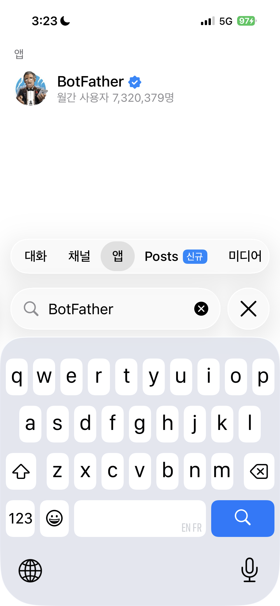 텔레그램 계정 BotFather를 대화 상대로 추가 : 찾기 -> 앱 -> BotFather 검색 -> 추가