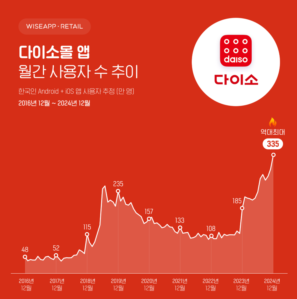이 변화는 앱 데이터에서도 선명하게 읽힌다. 와이즈앱·리테일·굿즈 조사에 따르면, 2024년 12월 다이소몰 앱 월간 사용자 수는 335만 명으로 앱 출시 이후 역대 최대치를 기록했다. 전년 동월 대비 81% 급증한 수치다.