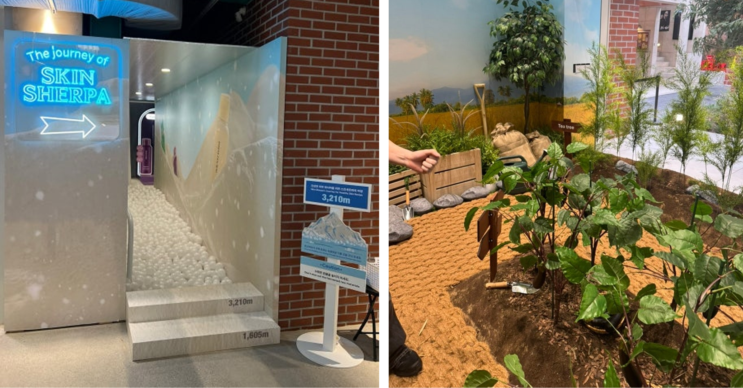파파레서피는 브랜드의 핵심 성분인 '효소'와 '자연 유래 원물'을 고객이 가장 직관적으로 이해할 수 있도록, 공간 전체를하나의 제작 공정처럼 설계했어요. 피부 타입을 진단받는 것으로 시작해, 밭처럼 꾸며진 공간에서 내 피부에 필요한 원물(티트리, 벼, 가지 등)을 직접 수확하고, 효소 파우더를 형상화한 볼풀존을 지나 나만의 효소 파우더 샘플을 완성하는 흐름이죠. 단순히 제품 설명을 듣는 것이 아니라, 원재료를 챙겨 제품을 완성해 나가는 과정에 동참하게 함으로써 브랜드와 제품에 대한 이해도를 높였어요.
