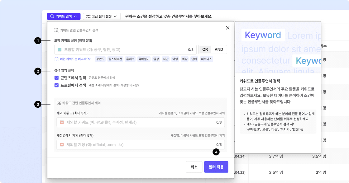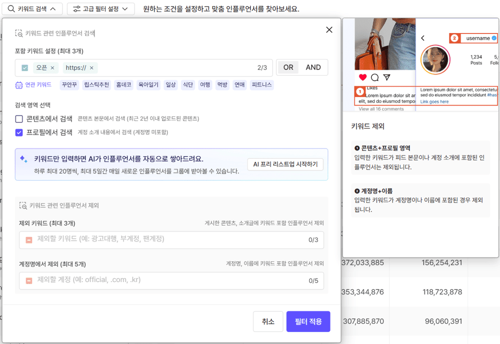 이 점을 활용해, 인플루언서 찾기 기능에서 [키워드 검색]에서