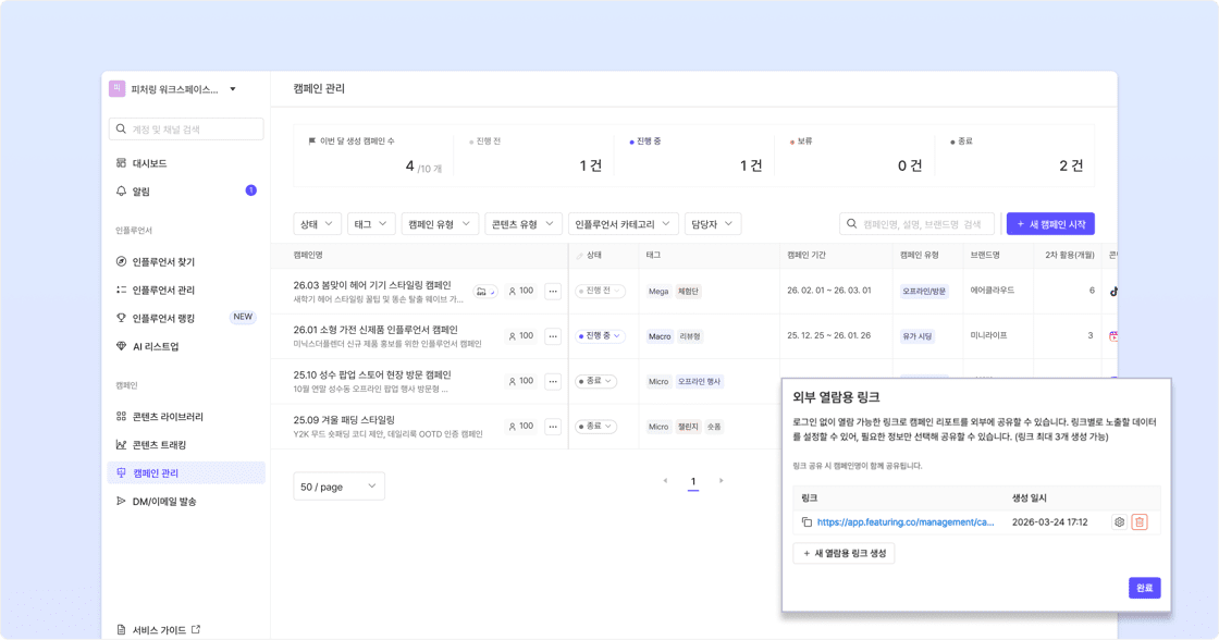인플루언서 찾기부터 캠페인 운영, 콘텐츠 성과, 오디언스 분석까지