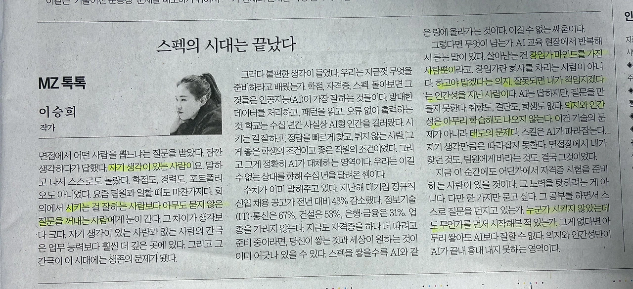‘스펙의 시대는 끝났다’는 칼럼. 저는 한경 주말판 이승희 작가 칼럼을 챙겨 읽습니다. 자기 생각이 있고 아무도 묻지 않는 질문을 꺼내는 사람. 잘못되면 내가 책임지겠다는 인간성, 하고자 하는 의지가 큰 사람. 결국 태도의 문제. 의지와 인간성은 AI가 할 수 없는 영역이니까.