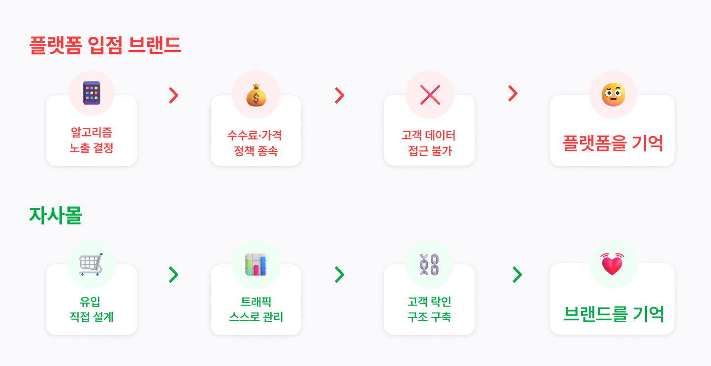 즉, 자사몰은 브랜드의 온라인 플래그십 스토어인 겁니다. 고객이 처음 유입되는 수간부터, 상품을 둘러보고, 리뷰를 남기고, 다시 찾아오기까지, 이 흐름이 끊기지 않고 하나로 연결될 때, 자사몰은 단순 판매 채널을 넘어 브랜드 경험을 전달하는 전략적 공간이 돼요. 그리고 그 자사몰을 갖춘 브랜드만이, 고객과의 관계를 계속 쌓아갈 수 있을 거예요.
