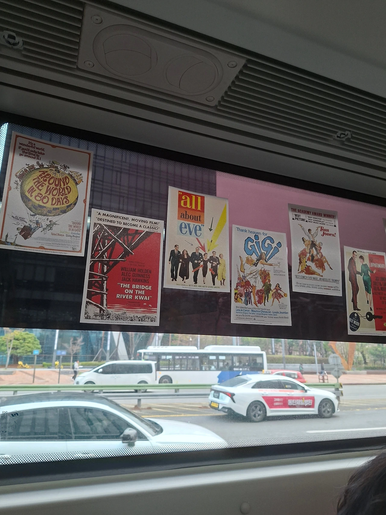 버스 곳곳에 영화 엽서가 붙어 있었습니다.