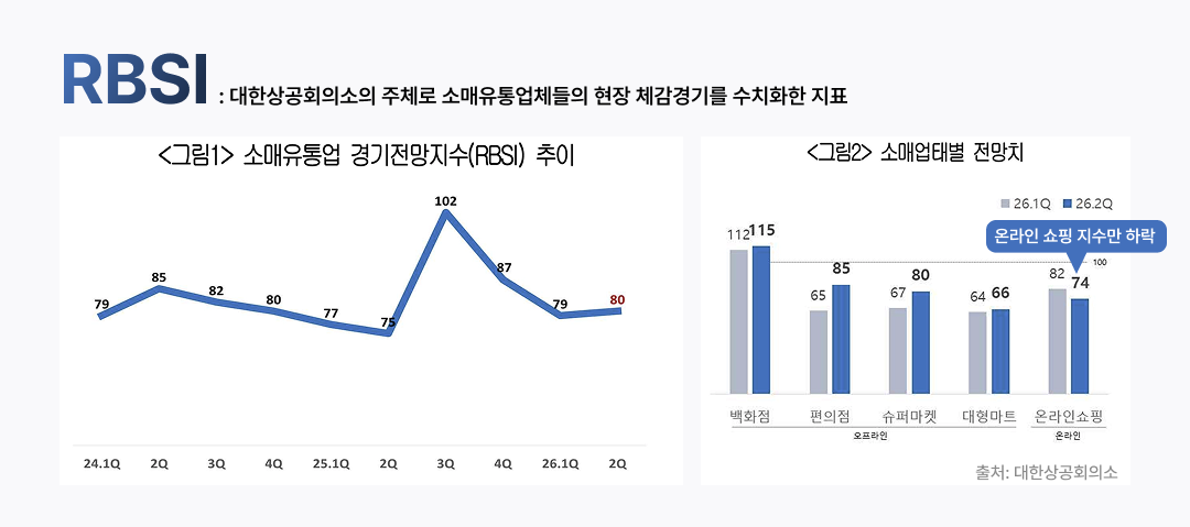 봄은 모든 곳이 반기는 계절이죠. 나들이, 가정의 달, 이사와 결혼, 축제 등 상승 모멘텀이 몰려있기 때문이에요. 하지만 올해는 조금 다른 신호가 찾아왔습니다. 대한상공회의소가 소매유통업체 500개사를 대상으로 조사한 2026년 2분기 소매유통업경기전망지수(RBSI)에 따르면 온라인 쇼핑 지수만 하락세를 기록했어요. 그 이유는 무엇일까요? 그리고 돌파구는 없는 걸까요?