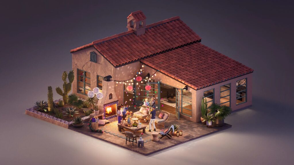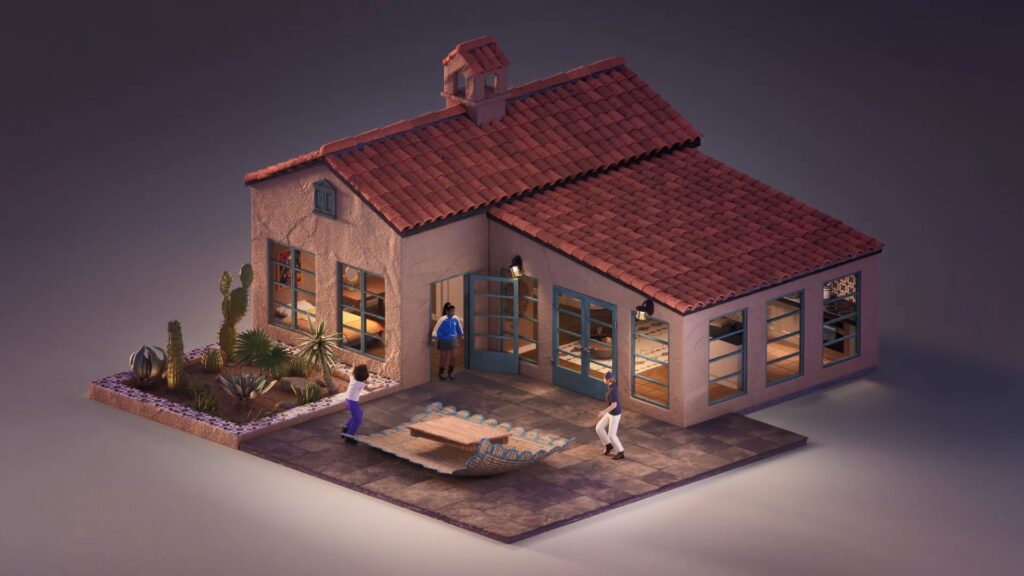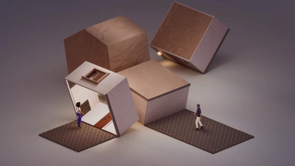 그 때 호텔방이 하나의 집으로 합쳐집니다. 친구들은 순식간에 한 공간에 모이게 됩니다. 닫혀있던 문을 열고 마당으로 나오는 친구들, 그리고…