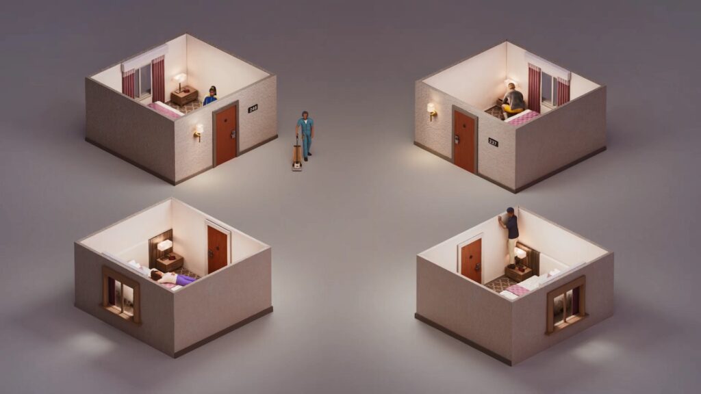 갑자기 방이 나타나 친구들을 가둡니다! 그리고 주인공 또한 갇히죠. 친구들 모두 각자의 호텔 방에 갇히고 말았습니다.