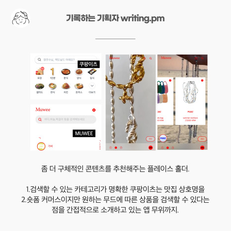 : 좀 더 구체적인 콘텐츠를 추천해주는 플레이스 홀더로는 ‘쿠팡이츠’와 ‘무위’가 있어요.