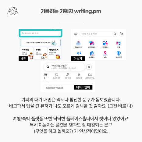 특히 야놀자는 플랫폼 명과도 잘 매칭되는 문구 (무엇을 하고 놀까요?) 가 인상적이었어요.