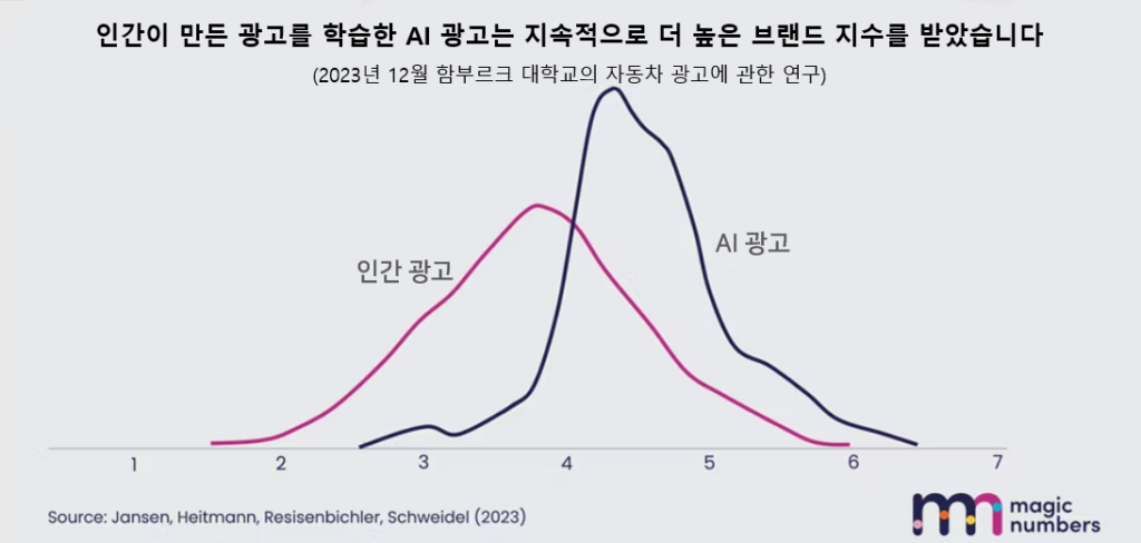 하지만 AI 광고는 ‘과거의 광고를 관찰하는 경우’ 아주 유용하게 사용될 수 있습니다. 아래 그래프에 따르면, AI 광고는 사람이 만든 광고보다 성능이 뛰어납니다. 평균적으로 AI 광고는 더 높은 브랜드 지수를 제공하고, 고객들에게 정확한 정보를 제공하고 있습니다.