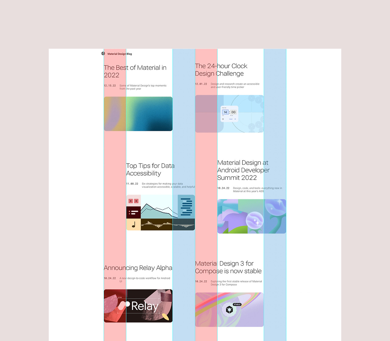 이 페이지의 레이아웃을 보면 왼쪽 부분의 X좌표(가로 시작점)가 다릅니다. 2개의 카드형 구성요소를 한 묶음으로 정하고 시작점을 다르게 교차하는 레이아웃입니다. 이러한 레이아웃은 조형요소 중에 “리듬”에 해당됩니다. 또한 좌우를 계속 교차시켜 어느 정도의 안정감을 확보할 수 있도록 “균형” 또한 적용되어 있습니다. 추가로 이 불규칙해 보이는 레이아웃도 사실 규칙이 있습니다. 아래 이미지를 한번 보겠습니다.