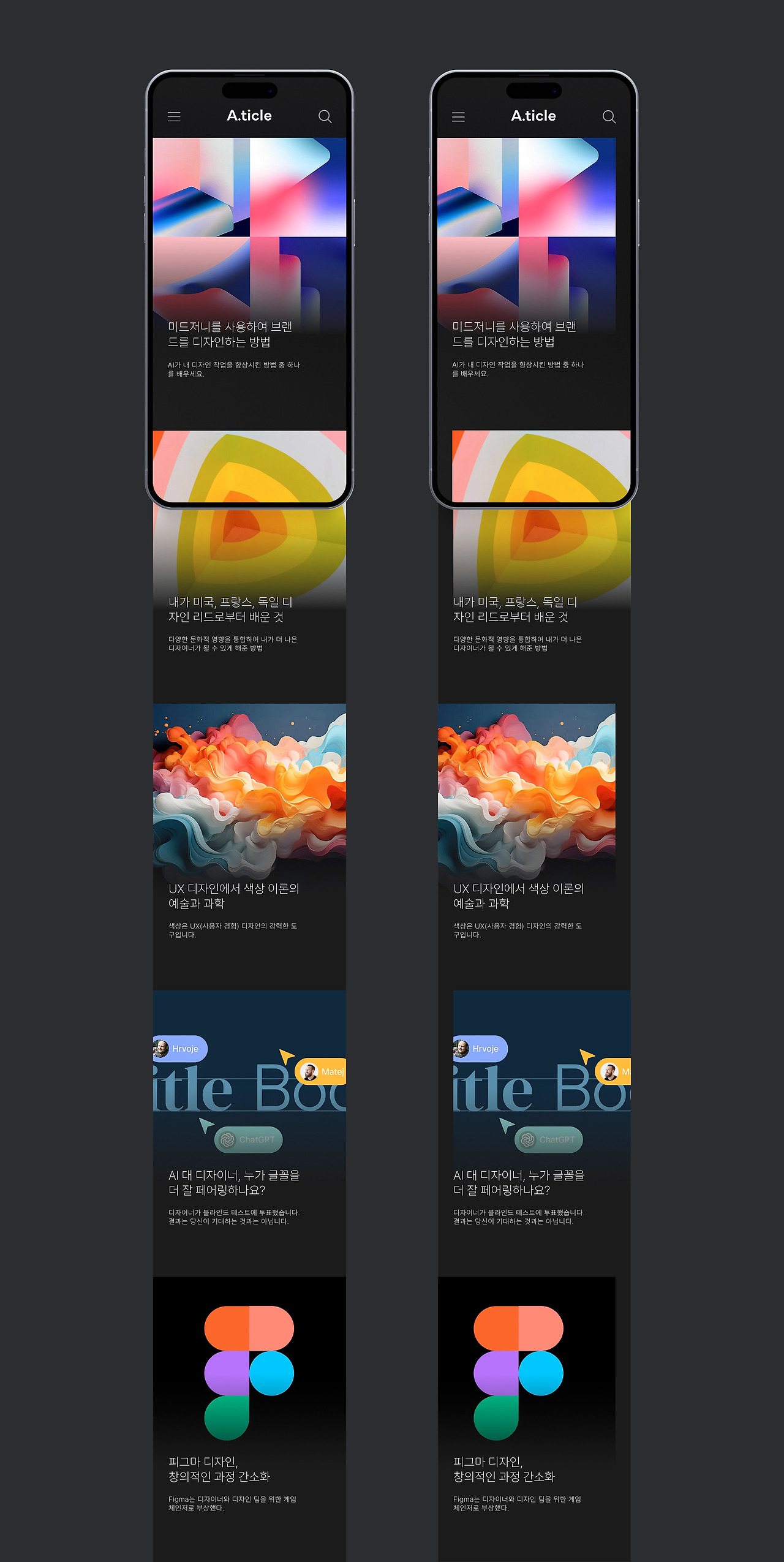 그럼 아티클 수집 사이트 모바일 메인을 하나 만들어 보도록 하겠습니다. 텍스트가 레이어드 되는 스타일로 제작하겠습니다.