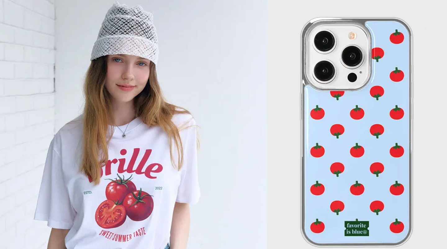 이를 시작으로 올여름 가장 주목받는 푸드코어 아이콘은 토마토입니다. 제철 감성과 어우러져 티셔츠, 폰케이스, 키링은 물론 시집 콜라보 굿즈나 화장법, 네일 디자인까지 토마토 감성이 다양하게 반영되고 있습니다.