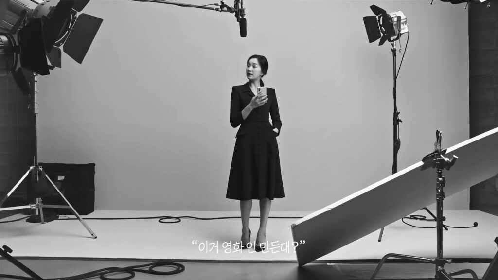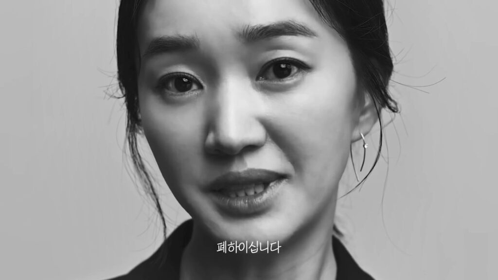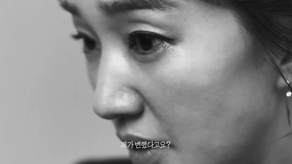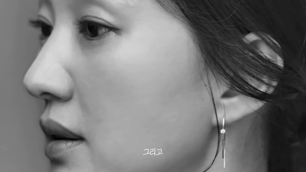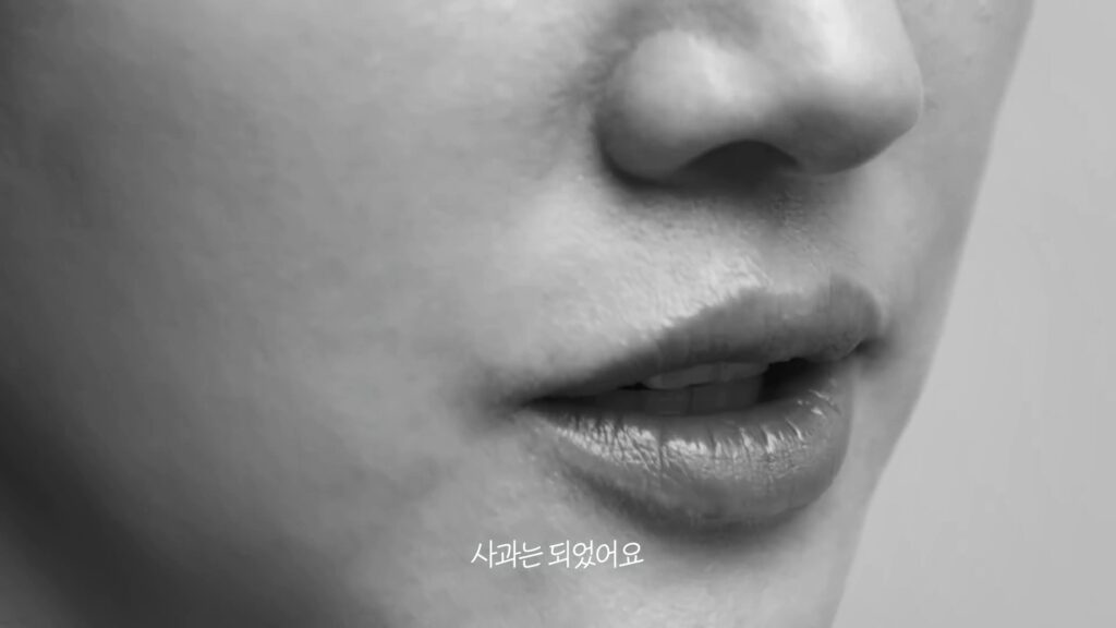 영상은 계속해서 배우의 연기만을 담아냅니다. 바스트샷, 클로즈업 구도를 통해 배우의 연기를 깊고 섬세하게 보여주고 있습니다. 흑백의 색감은 시선을 오직 배우에게만 고정시켜 집중도를 높입니다🌟