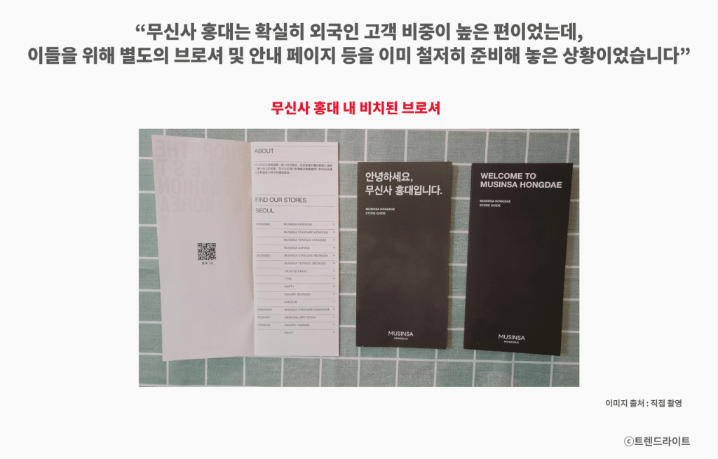 이를 잘 아는 무신사는 매장 내에 본인들이 운영하는 다양한 공간 정보를 제공하는 외국어 브로셔를 배치하고, 적극적으로 이를 알리고 있는데요. 이미 서울, 대구, 부산에 위치한 본인들의 매장을 알리는 별도 페이지를 구축하기도 했습니다. 여기서 더 나아가 무신사 홍대는 내부 스텝들의 70%를 외국어 소통이 가능한 인원으로 채울 정도로 만반의 준비를 한 상황이기도 합니다. 또한 향후에는 QR코드를 통해 글로벌 앱도 연동되게 하여, 외국인 고객의 옴니 채널 경험마저 구축할 계획이라 하고요.