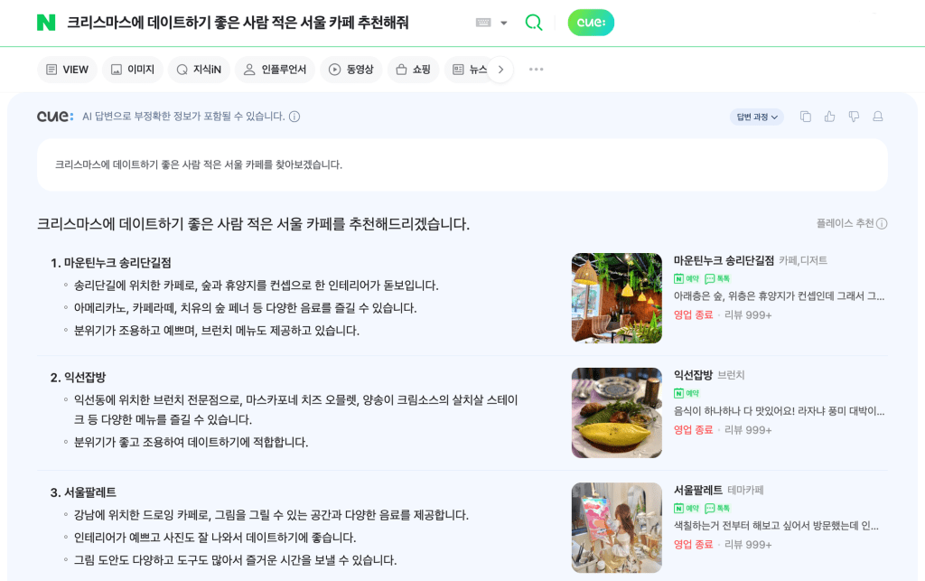 네이버의 경우 제안 혹은 명령 어조로 검색했을 때 생성 AI가 기능을 합니다. ‘크리스마스’, ‘데이트’, ‘사람 적은’, ‘서울’, ‘카페’ 등 꽤나 복잡한 고려 사항을 복합적으로 해석해 질문 의도에 맞는 응답과 제안을 해주죠.