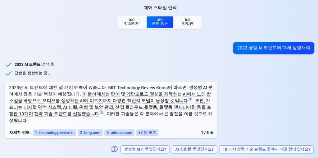 ChatGPT를 기반으로 하는 Bing은 특이하게 대화 스타일을 선택해 필요에 맞는 정보를 얻을 수 있어요.