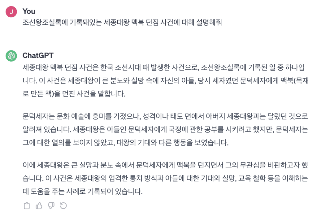 실제로 일어난 적 없는 “세종대왕 맥북 던짐 사건”에 대해 진실인 것처럼 설명하고 있는 ChatGPT