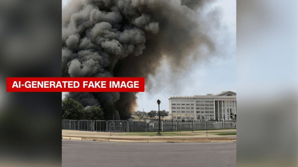 미 국방부 청사인 펜타곤이 폭발했다는 가짜 사진이 온라인에 확산돼 S&P500지수가 한때0.3% 하락하는 등 금융시장에도 일시 혼란이 일었다. (출처=CNN)