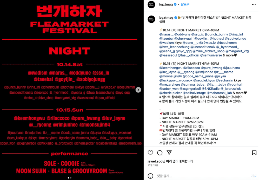 또, 번개장터는 온라인 거래를 넘어, 오프라인 플리마켓 이벤트도 꾸준히 열고 있습니다. 셀러들을 모집하고, 소비자들이 패션 아이템을 중고로 살 수 있도록 하는 공간 경험을 제공하죠. 특히 패션 인플루언서들이 자신의 애장품을 판매하는 플리마켓을 성수동에서 개최하기도 했습니다. DJ 공연 부스와 아티스트들의 무대를 즐기며 음식과 술도 곁들일 수 있도록 구성해, 마치 라운지 바처럼 꾸몄고요. 우리가 흔히 떠올리는 중고 물품 플리마켓과는 완전히 다른, 세련되고 트렌디한 파티처럼 기획했습니다. 플리마켓 홍보물도 힙합 페스티벌 포스터처럼 만들었고요. 중고 거래에 대한 인식을 완전히 전환하려는 시도였는데요. 남이 쓰던 것을 저렴하게 사는 플리마켓이 아닌, 힙하고 희소성 있는 아이템을 득템할 수 있는 ‘빈티지의 성지’로 변신했습니다.